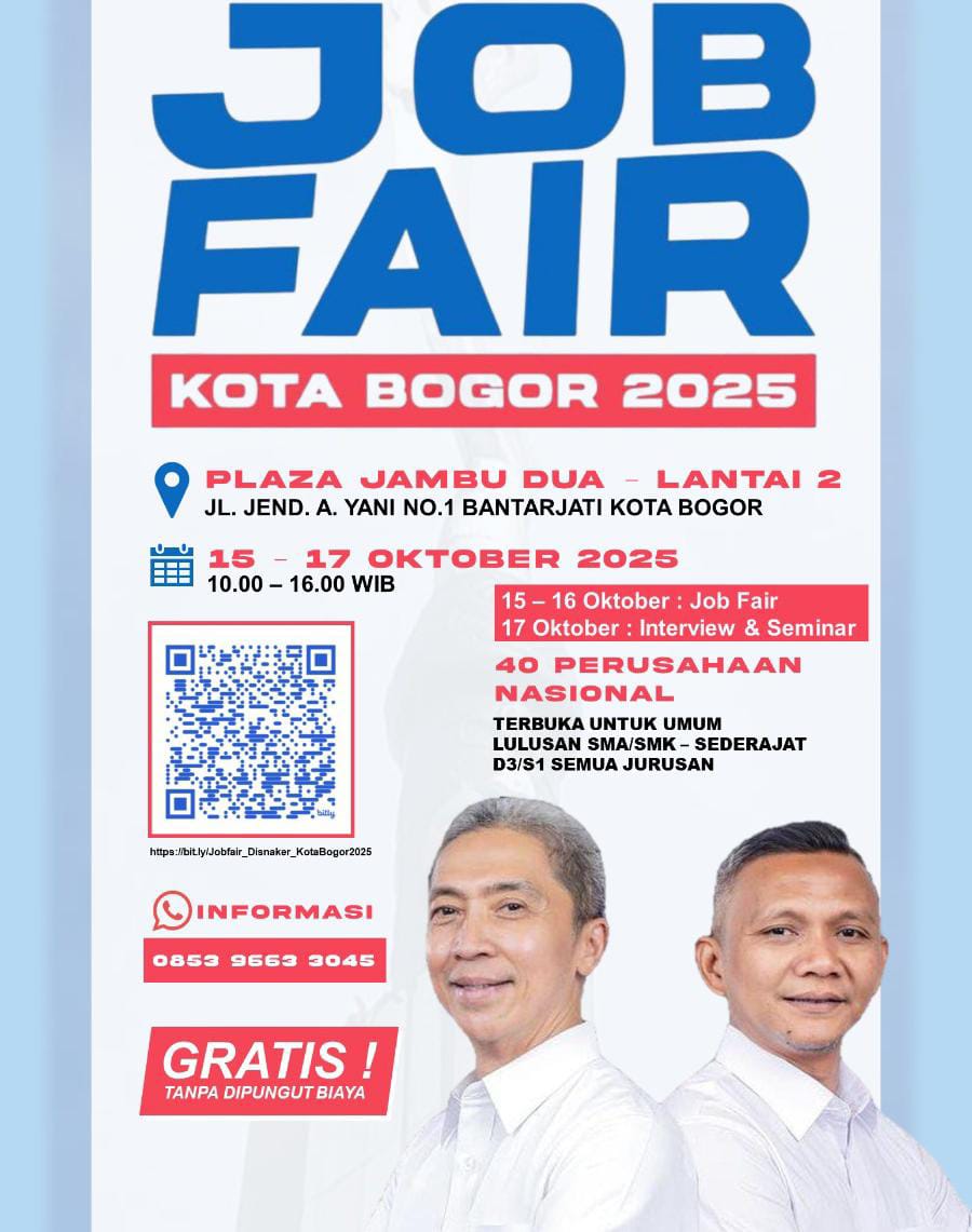 BOGOR – Pemerintah Kota (Pemkot) Bogor melalui Dinas Tenaga Kerja (Disnaker) kembali mengadakan Job Fair Kota Bogor 2025 yang akan berlangsung pada 15 hingga 17 Oktober 2025 di Lantai II Plaza Jambu Dua, Kota Bogor.