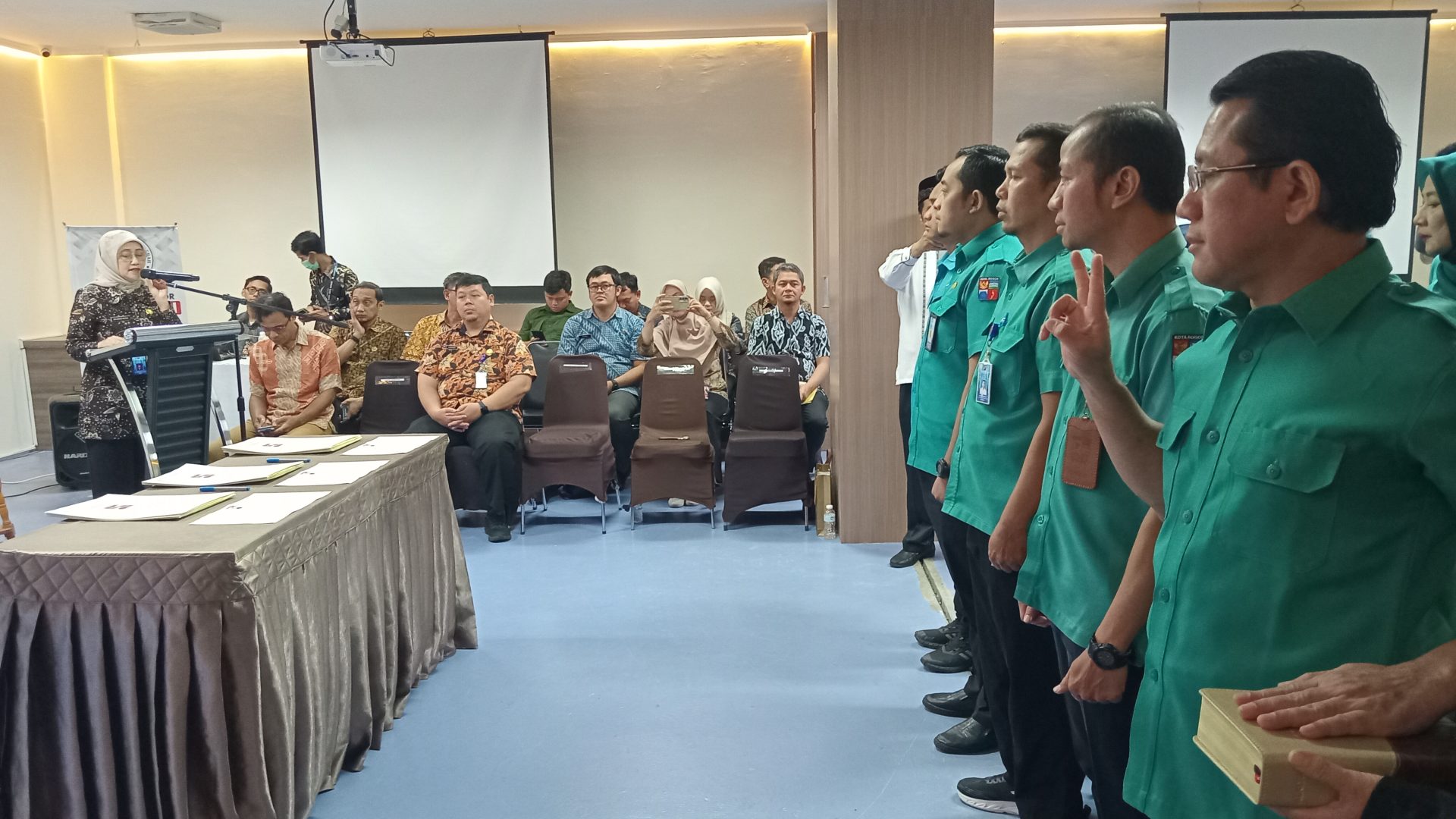 Prosesi pelantikan dipimpin langsung Direktur RSUD Kota Bogor Sri Nowo Retno, serta dihadiri Sekretaris Daerah Kota Bogor Denny Mulyadi, Inspektur Daerah Kota Bogor Irwan Riyanto, Ketua Dewan Pengawas RSUD Kota Bogor Hanafi, dan Plt Kepala Bagian Pengadaan Barang dan Jasa Kota Bogor Undang Sulaeman.