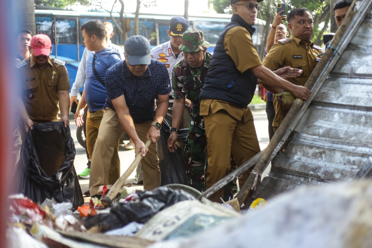 Selain membersihkan sampah, kegiatan ini juga diiringi dengan penertiban bangunan liar yang berdiri di sepanjang ruas jalan tersebut.